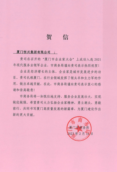 廈門市商務(wù)局發(fā)來(lái)賀信,祝賀廈門恒興集團(tuán)成功入選2021年現(xiàn)代服務(wù)業(yè)領(lǐng)軍企業(yè)。